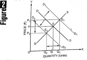 (2) चित्र 5 (B) से ज्ञात होता है कि माँग में कमी होने के फलस्वरूप यदि माँग वक्र नीचे की ओर खिसक कर D2D2 हो जाती है तो नया संतुलन बिंदु E2 होगा। बिंदु E2 से ज्ञात होता है कि संतुलन कीमत OP से कम होकर OP2 हो जाएगी परंतु संतुलन मात्रा OQ ही रहेगी।
