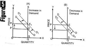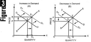 चित्र 3 (A) से ज्ञात होता है कि पूर्ति SS वक्र के स्थिर रहने पर माँग के बढ़ने के कारण DD माँग वक्र ऊपर दाईं ओर खिसककर D1 D1 हो गया है। यह पूर्ति वक्र SS को E1 बिंदु पर काट रहा है इसलिये E1 नया संतुलन बिंदु होगा। इससे ज्ञात होता है कि नई संतुलन कीमत बढ़कर OP1 हो जाएगी तथा संतुलन मात्रा बढ़कर OQ1 हो जाएगी।