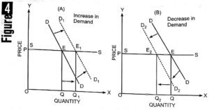 (i) चित्र 4(A) से ज्ञात होता है कि वस्तु का पूर्ति वक्र SS पूर्णतया लोचदार है। प्रारंभिक माँग वक्र DD पूर्ति वक्र SS को E बिंदु पर काट रही है। इसलिए बिंदु E संतुलन बिंदु होगा। बिंदु E से ज्ञात होता है कि वस्तु की संतुलन कीमत OP तथा संतुलन मात्रा OQ है। यदि माँग में वृद्धि होने के फलस्वरूप माँग वक्र दाईं ओर खिसक कर D1D1 हो जाती है तो नया संतुलन बिंदु E1 होगा। बिंदु E1 से ज्ञात होता है कि संतुलन कीमत OP ही रहेगी परंतु संतुलन मात्रा बढ़कर OQ हो जायेगी।