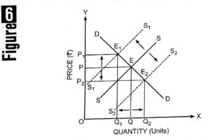 चित्र 6 पूर्ति में परिवर्तन की स्थिति को दर्शाता है। पूर्ति में वृद्धि होने पर संतुलन कीमत OP से घटकर OP2 हो जाती है। संतुलन मात्र OQ से बढ़कर OQ2 हो जाती है । पूर्ति में कमी होने पर संतुलन कीमत OP से बढ़कर OP1 हो जाती है। संतुलन मात्रा OQ से घटकर OQ1 हो जाती है।