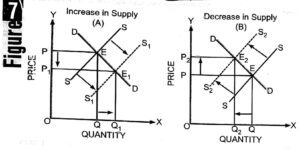 चित्र 7 (A) से ज्ञात होता है कि माँग वक्र DD के स्थिर रहने पर पूर्ति के बढ़ने के कारण पूर्ति वक्र SS नीचे दाईं ओर खिसककर S1S1 हो गया है। यह माँग वक्र DD को E1 बिंदु पर काट रहा है। इसलिये E1 नया संतुलन बिंदु होगा। इससे ज्ञात होता है कि नई संतुलन कीमत कम होकर OP1 हो जायेगी तथा संतुलन मात्रा बढ़कर OQ1 हो जायेगी।