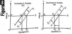 (i) चित्र 8 (A) से ज्ञात होता है कि DD पूर्णतया लोचदार माँग वक्र है। प्रारंभिक पूर्ति वक्र SS है। यह माँग वक्र DD को बिंदु E पर काट रही है इसलिए बिंदु E संतुलन बिंदु होगा। इस बिंदु E से ज्ञात होता है कि संतुलन कीमत OP तथा संतुलन मात्रा OQ होगी। पूर्ति में वृद्धि हो जाने के कारण यदि पूर्ति वक्र नीचे दाईं ओर खिसककर S1S1 हो जाता है तो नया संतुलन हो जायेगी। बिंदु E होगा। बिंदु E1 से ज्ञात होता है कि संतुलन कीमत OP ही रहेगी। परंतु संतुलन मात्रा बढ़कर OQ1