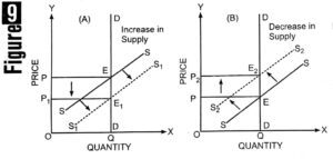 (i) चित्र 9 (A) से ज्ञात होता है कि DD पूर्णतया बेलोचदार माँग वक्र है। प्रारंभिक पूर्ति वक्र SS है। यह माँग वक्र DD को बिंदु E पर काट रही है अत: बिंदु E संतुलन बिंदु होगा । इस बिंदु E से ज्ञात होता है कि संतुलन कीमत OP तथा संतुलन मात्रा OQ होगी। यदि पूर्ति में वृद्धि हो जाने के कारण पूर्ति वक्र नीचे की ओर खिसककर S1S1 हो जाता है तो नया संतुलन बिंदु E होगा। बिंदु E1 से ज्ञात होता है कि संतुलन कीमत कम होकर OP1 हो गई है। परंतु संतुलन मात्रा OQ ही रहेगी।