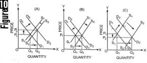 (ii) चित्र 10(B) से ज्ञात होता है कि माँग और पूर्ति में समान वृद्धि हुई है। इसलिए कीमत में कोई परिवर्तन नहीं हुआ। कीमत पहले जितनी अर्थात् OP1 ही है परंतु वस्तु की माँग तथा पूर्ति की मात्रा OQ1 से बढ़कर OQ2 हो गई। अतएव जब माँग और पूर्ति में वरावर की वृद्धि होती है तो संतुलन कीमत में कोई वृद्धि नहीं होती । परंतु संतुलन मात्रा बढ़ जाती है।