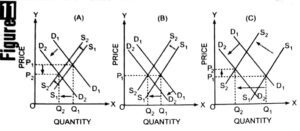 (iii) चित्र 11(C) से ज्ञात होता है कि पूर्ति में होने वाली कमी माँग में होने वाली कमी की तुलना में अधिक हुई है। इसलिए कीमत OP1 से बढ़कर OP 2 हो गई है परंतु संतुलन मात्रा OQ से घटकर 0Q2 हो गई है। अतएव जब पूर्ति में कमी माँग की तुलना में अधिक होती है तो संतुलन कीमत बढ़ जाती है तथा संतुलन मात्रा घट जाती है ।