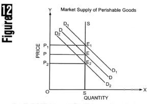 बाजार कीमत का निर्धारण चित्र 12 से स्पष्ट हो जाता है। इस चित्र में OX- अक्ष पर वस्तु की मात्रा तथा OY-अक्ष पर कीमत दिखाई गई है। SS वस्तु की पूर्ति रेखा है। यह OY अक्ष के समानांतर एक लंब रेखा है जिससे प्रकट होता है कि वस्तु की पूर्ति एक स्थिर मात्रा है। DD माँग वक्र है। यह SS रेखा को बिंदु E पर काटती है, इसलिये इस बिंदु पर कीमत OP होगी। यदि किन्हीं कारणों द्वारा माँग बढ़ जाती है तो नई माँग वक्र D, D, होगी जो पूर्ति वक्र SS को E, बिंदु पर काटेगी। इसका अर्थ यह हुआ कि वस्तु की OS मात्रा की कीमत OP से बढ़कर OP, हो जायेगी। यदि माँग घट जाती है तो नई माँग वक्र D2D2 होगी जो पूर्ति वक्र SS को E2 बिंदु पर काटेगी । वस्तु की कीमत OP से कम होकर OP2 रह जायेगी।