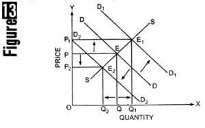 मान लीजिए यदि माँग में वृद्धि होने के कारण माँग वक्र दाईं ओर खिसक कर D1D1 हो जाता है। नई माँग वक्र D1D1 पूर्ति वक्र SS को E1 बिंदु पर छू रही है । अतः E, बिंदु नया संतुलन बिंदु होगा तथा OQ नई संतुलन मात्रा और OP, नई संतुलन कीमत होगी। इसके विपरीत माँग में पूर्ति की तुलना में कमी होने के कारण माँग वक्र बाईं ओर खिसक कर D2 D2 हो जायेगी। नई माँग वक्र D2D2 पूर्ति वक्र SS को E2 बिंदु पर काट रही है । अत: E2 नया संतुलन बिंदु होगा। इस बिंदु पर OP2 नई संतुलन कीमत होगी तथा OQ2 नई संतुलन मात्रा होगी।