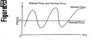 चित्र 14 में OX-अक्ष पर वस्तु की मात्रा तथा OY – अक्ष पर कीमत प्रकट की गई है। उद्योग की माँग वक्र DD तथा LS दीर्घकालीन पूर्ति वक्र हैं। उद्योग की माँग वक्र तथा पूर्ति वक्र E बिंदु पर एक-दूसरे को काट रही हैं, इसलिये सामान्य कीमत OP निर्धारित होगी। यदि किसी कारणवश उद्योग, कीमत को बढ़ाकर OP से OP1 कर देता है तो कीमत फिर से दोबारा OP हो जायेगी। इसका कारण यह है कि OP1 कीमत पर माँग OQ2 है तथा वस्तु की पूर्ति OM है। वस्तु की पूर्ति (OM) के माँग (OQ2) से अधिक होने के कारण उद्योग को कीमत कम करनी पड़ेगी, इस प्रकार कीमत कम होकर OP हो जायेगी। इसके विपरीत यदि किसी कारणवश उद्योग को कीमत OP से कम करके OP2 करनी पड़ती है तो यह कीमत भी स्थिर नहीं रहेगी। कीमत OP2 से बढ़कर OP हो जायेगी । इसका कारण यह है कि OP2 कीमत पर माँग (OQ1) है तथा पूर्ति (ON) है। वस्तु की माँग (OQ 1) पूर्ति (ON) से अधिक है। माँग के पूर्ति से अधिक होने पर कीमत में वृद्धि होगी तथा कीमत बढ़कर OP हो जायेगी । चित्र 15 से ज्ञात होता है कि बाजार कीमत की प्रवृत्ति सामान्य कीमत के इर्दगिर्द घूमने की होती है।