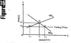 उच्चतम कीमत (Ceiling Price) OP1 है। इस कीमत के फलस्वरूप पूर्ति घटकर P1a और माँग बढ़कर P1b हो जाएगी। परिणामस्वरूप माँग में पूर्ति से अधिक (TR के बराबर ) वृद्धि हो जायेगी । अर्थात्