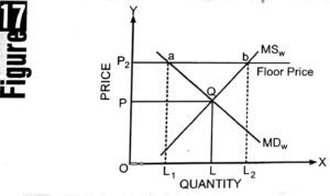 यदि न्यूनतम कीमत OP2 निर्धारित की जाती है तो यह (संभावित) संतुलन कीमत से ऊँची है। फलस्वरूप पूर्ति में P2b विस्तार और माँग में P2a संकुचन होता है । इसके फलस्वरूप पूर्ति आधिक्य (Excess Supply) ab की स्थिति उत्पन्न हो जायेगी। अर्थात् पूर्ति > माँग ।