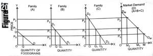 चित्र 20(A), 20 (B) और 20 (C) में तीन परिवारों A, B तथा C के माँग वक्र और चित्र 20 (D) में बाजार माँग वक्र दिखाए गए हैं। ‘A’ अति निर्धन परिवार है, B परिवार ‘C’ से निर्धन है और ‘C’ धनी परिवार है। OP0 कीमत पर तीनों परिवार अनाज को खरीदने में सामर्थ्य हैं। जब कीमत बढ़कर OP1 हो जाती है तब ‘A’ परिवार बाजार से हट जाता है जबकि ‘B’ और ‘C’ परिवार अब भी अनाज को खरीदने के योग्य है। OP2 कीमत पर, ‘A’ तथा ‘B’ दोनों परिवार अनाज खरीदने के अयोग्य हैं। अत: उन्हें भूखमरी (Starvation) का सामना करना पड़ता है। बाजार माँग वक्र (जोकि तीन परिवारों के माँग वक्रों का समस्तरीय जोड़ है) से यह स्पष्ट होता है कि बाजार कीमत के बढ़ने से अनाज की उपलब्धि कम होती जाती है। यही प्रो. सेन का “ खाद्य उपलब्धता अपकर्ष सिद्धांत” (Food Availability Decline – FAD Theory) है।